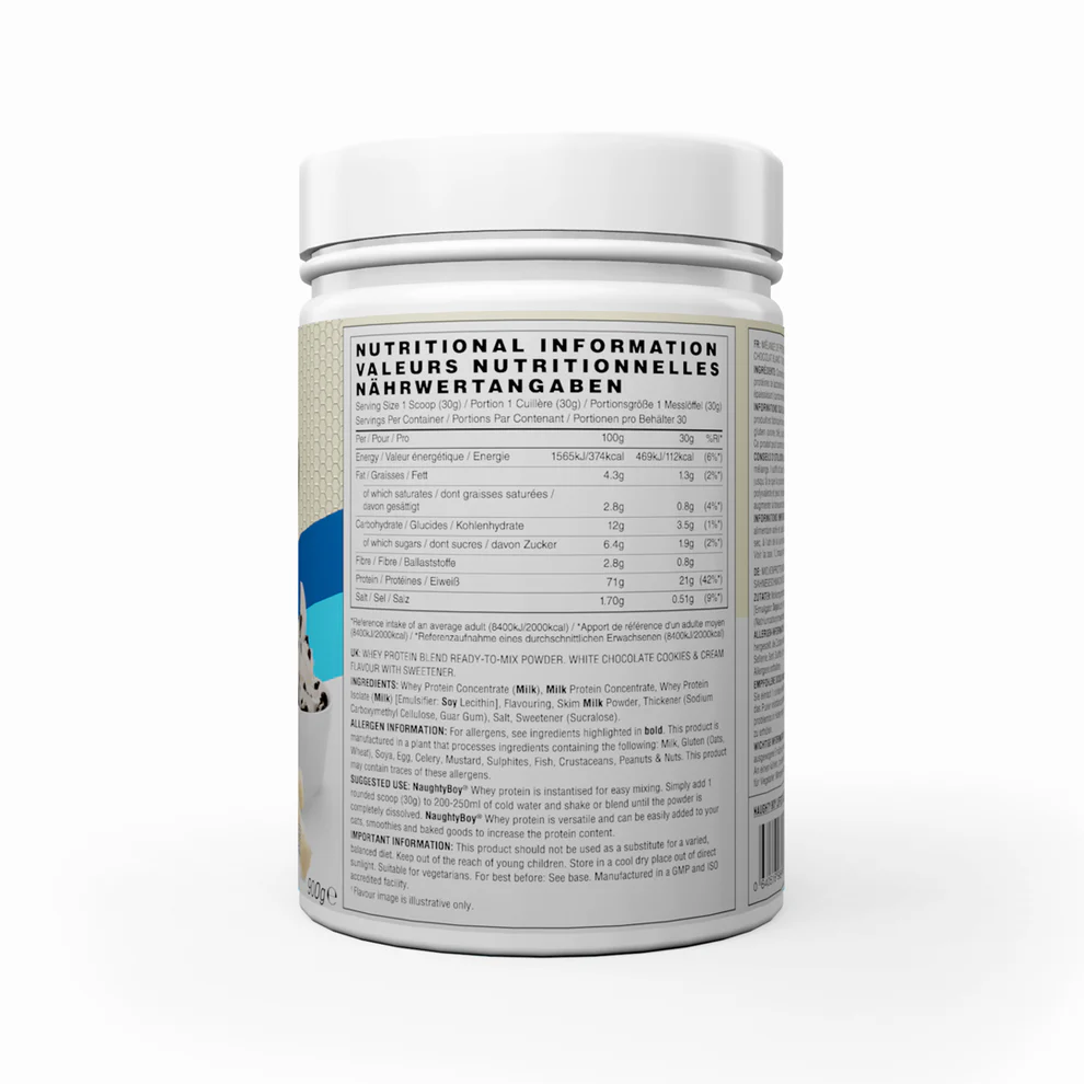 White chocolate cookies whey protein by Naughty Boy, crafted to support muscle recovery and daily protein goals. Sweet flavour and smooth mixability make it a satisfying choice after workouts.